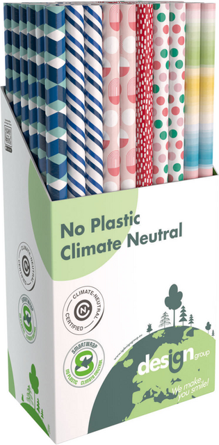 * Voor iedere gelegenheid het juiste inpakpapier. * Of het nu voor een verjaardag is of voor een jubileum, er zit altijd wel een passend dessin bij. * Dit zijn duurzame en folieloze rollen inpakpapier, ze zijn op een speciale wijze gewikkeld, waardoor er geen plastic meer nodig is en daardoor minder afval. * Deze doos in Geo thema bevat 60 rollen in 6 verschillende dessins. * Afmetingen per rol: 200x70cm.