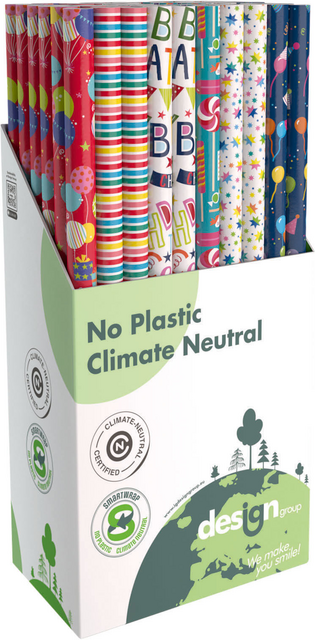 * Voor iedere gelegenheid het juiste inpakpapier. * Of het nu voor een verjaardag is of voor een jubileum, er zit altijd wel een passend dessin bij. * Dit zijn duurzame en folieloze rollen inpakpapier, ze zijn op een speciale wijze gewikkeld, waardoor er geen plastic meer nodig is en daardoor minder afval. * Deze doos in Party thema bevat 60 rollen in 6 verschillende dessins. * Afmetingen per rol: 200x70cm.