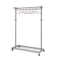 Mobiel. 4 zwenkwieltjes met rem. 2 legplanken in metaaldraad voor accessoires. Stijlen en structuur in aluminiumgelakt metaal. 6 haken en accessoirehouder met houten uiteinden. Afmetingen bovenste legplank: 106 x 30 cm. Afmetingen onderste legplank: 106 x 45 cm. Tot. afmetingen: L 124 x D 56 x H 177 cm.