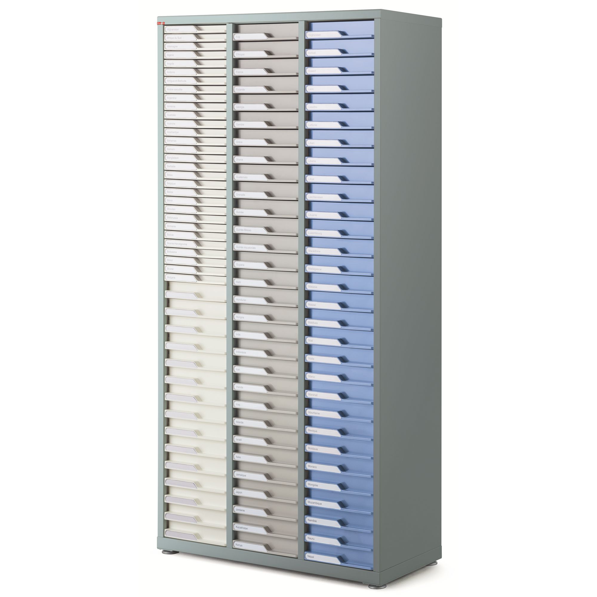 Leeg meubel uit te rusten met 6 setjes antischok polystyreen laden, met etiketten en etikethouders. 2 setjes laden = 1 kolom: set van 15 laden van 6 cm of set van 30 laden van 3 cm.