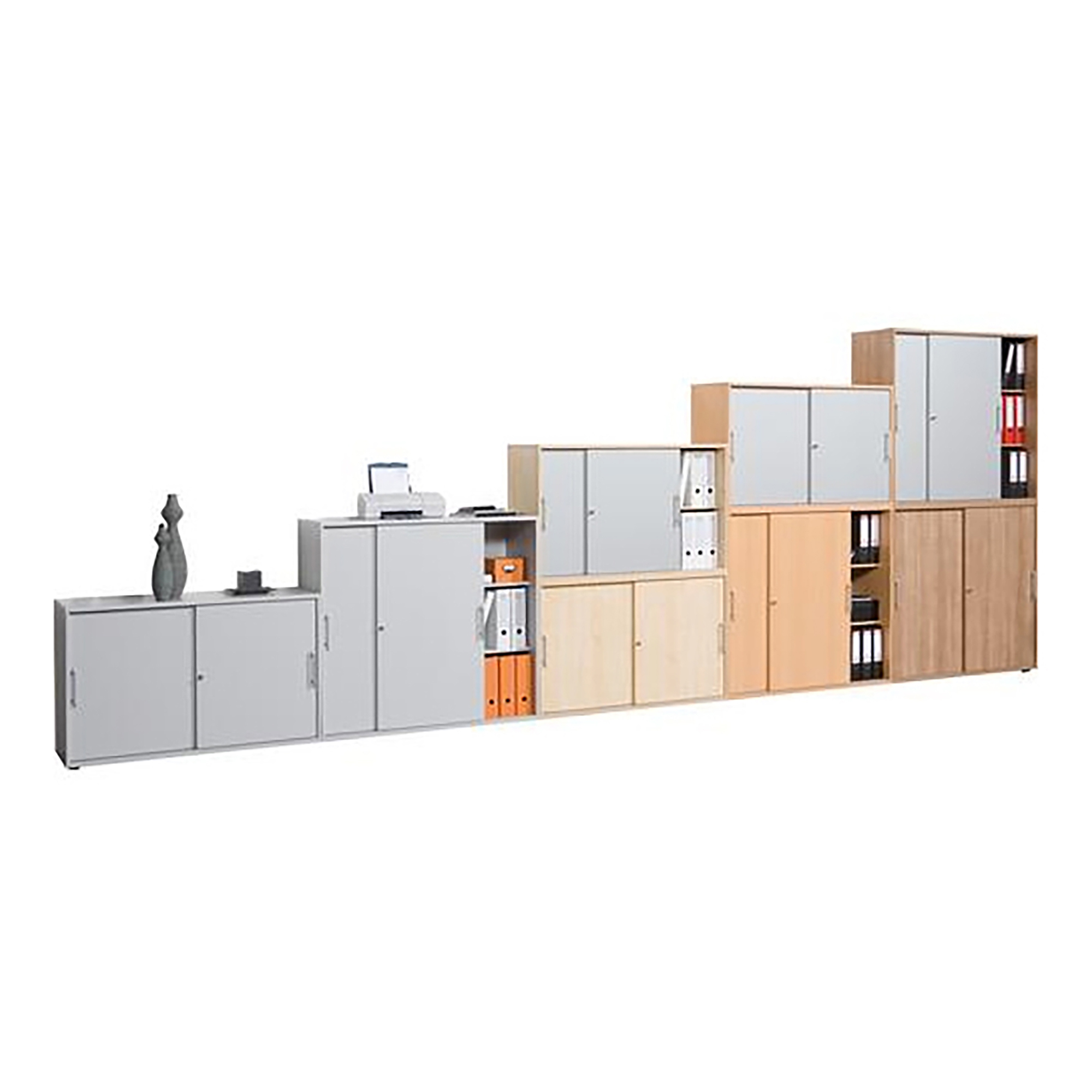 Structuur : spaanplaat bekleed met melaminelaag (DIN 68765 - Klasse E1). Voorzijde met 2 mm dikke beschermstrook in ABS, afgerond. Dikte zijkant: 16 mm, dikte boven- en onderkant: 22 mm. Rug: 3 mm (in groeven vastgeschroefd) - steeds zilverkleurig.Sluiting: loopgedeelte "Slide Line" onderaan op 2 wieltjes per deur in een geleider (met hoogteregeling) - bovenaan met 2 blokjes per deur in een geleider.Uitrusting: legplanken dikte: 16 mm, voorzijde met 2 mm dikke beschermstrook in ABS, afgerond. Hoogte is verstelbaar per 32 mm.Afmetingen: breedte : 120 cm. Hoogte : 74,8 cm en 110 cm (stapelbare combinaties: 149,6 - 184,8 - 220 cm). Diepte: 40 cm.Sokkel: 5 ronde pootjes (zwart - H 20 mm), bovenaan via de bodem in hoogte verstelbaar.Slot: drukcilinderslot, standaard sluiten beide deuren tegelijk (op aanvraag kan voor elke deur apart een slot bekomen worden).Handvat: zilverkleurig in kunststof, 128 mm. Draagvermogen: 25 kg/legplank.