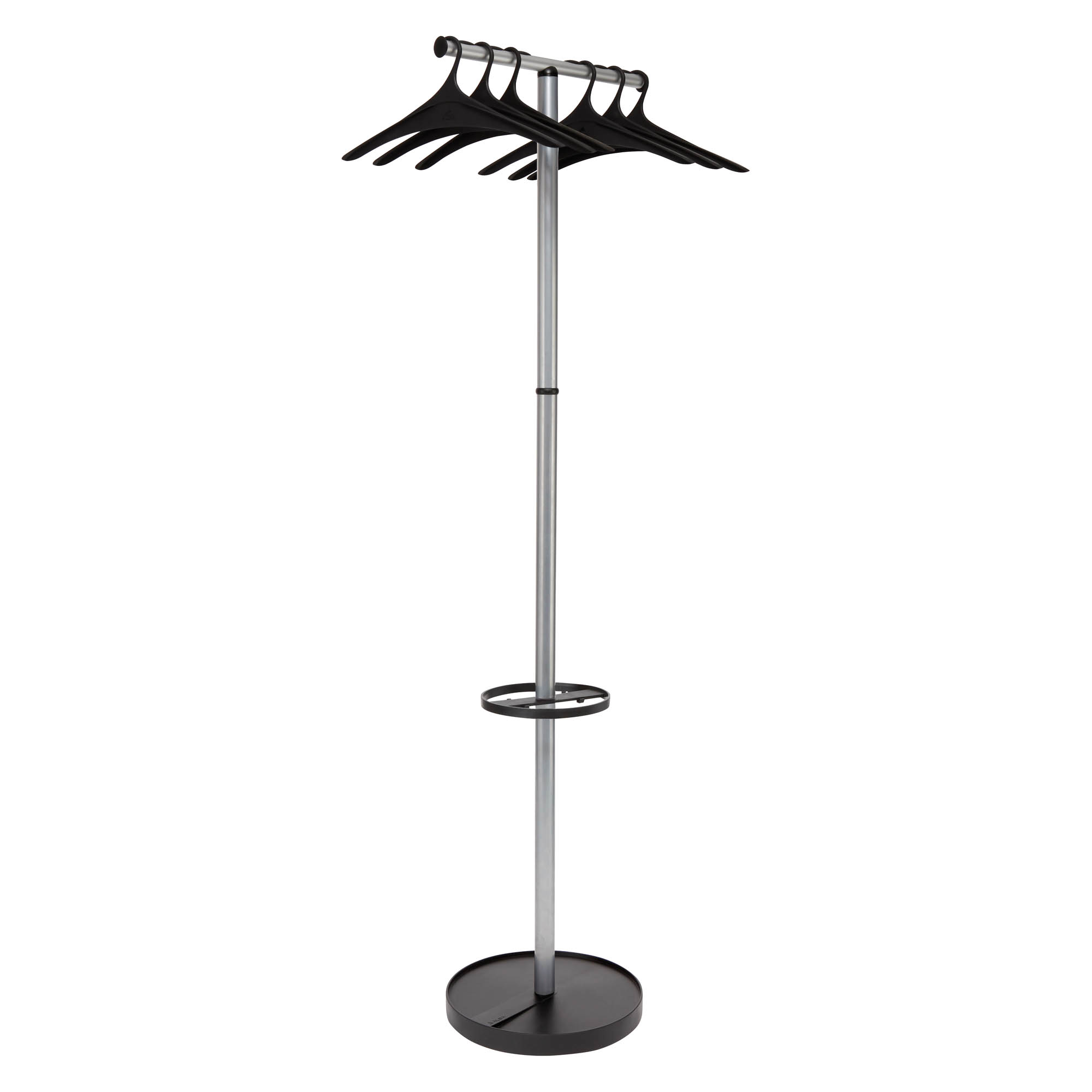 Als een echte dressing op voet is dit Welle kledingrek samengesteld uit een kop voorzien van een ophangstang, waaraan u 6 kleerhangers (inbegrepen) kunt bevestigen, een parapluhouder en een verzwaarde metalen basis voor een optimale stabiliteit (5 kg), voorzien van een lekbak.