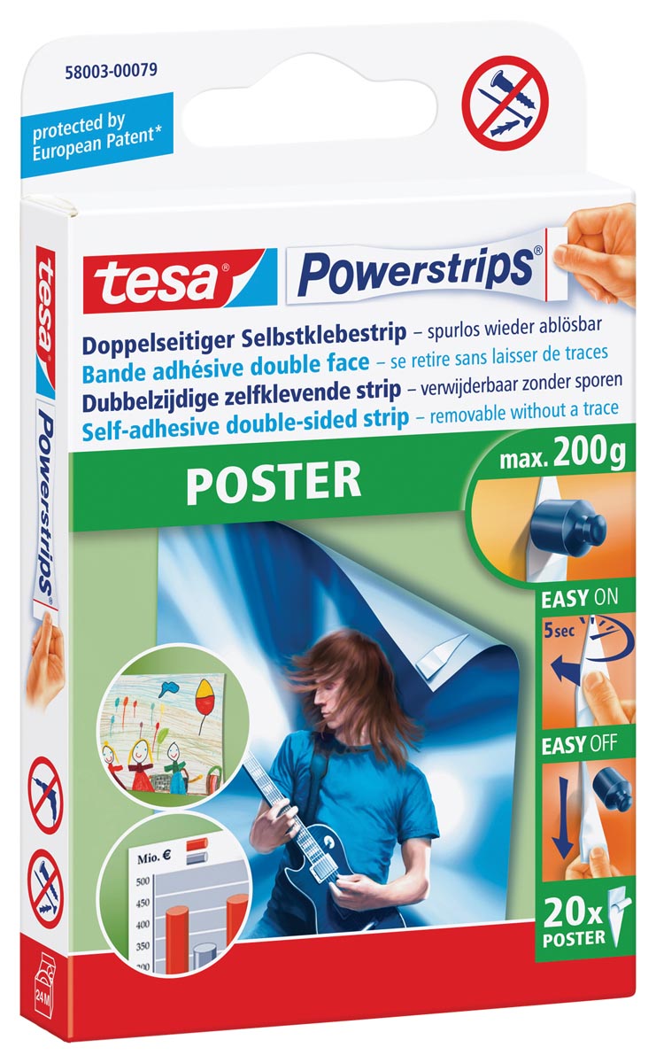 * De zelfklevende tesa Powerstrips Poster zijn perfect om posters aan de muur te hangen zonder de muur en de poster zelf te beschadigen. * tesa Powerstrips® Poster zijn speciaal gevormde dubbelzijdige zelfklevende kleefstrips. * Ze zijn gemaakt om posters eenvoudig op te hangen met het grote voordeel dat het papier van de poster noch de muur wordt beschadigd (geschikt voor de meeste oppervlakken). * Deze speciale posterstrips verwijder je zonder zichtbare sporen na te laten op de muur. * Ze vormen niet alleen een uitstekende oplossing voor schadevrij ophangen zonder gereedschap, spijkers of zelfs punaises, het is een slim idee voor het permanent of tijdelijk ophangen van decoratieve posters of informatieve kaarten en illustraties. * Draagkracht tot 200 g. * Dankzij de speciale vorm zeer geschikt voor lichte en gevoelige materialen. * Posters verplaatsbaar zonder beschadiging van poster of ondergrond. * Niet geschikt voor gebruik op Styrofoam®, geschuimd materiaal en poreuze materialen