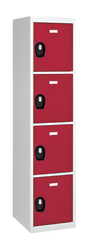 Wenst u de inrichting van uw lokaal te optimaliseren? Kies dan deze kolomkast met 4 vakken. Dit model is geschikt voor de opberging van diverse zaken, en in het bijzonder voor motorhelmen. De robuuste kast is gemaakt van staalplaat, dikte 6/10e, met een epoxygelakte afwerking, bestand tegen schokken en krassen. Om de inhoud of de eigenaar van de locker te benoemen is deze voorzien van een etikethouder in antracietkleurig plastic. Voor een goede beveiliging is de deur uitgerust met een slot voor een hangslot en een omega-profiel over de volledige hoogte. De deur is beschikbaar in drie kleuren : blauw, rood, antracietgrijs.