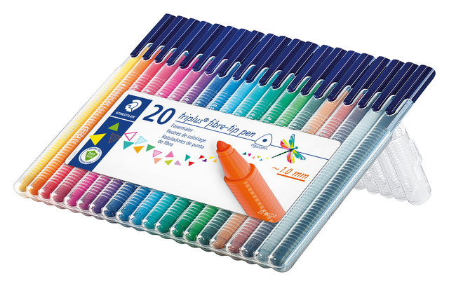 Triplus color 323 driekantige viltstift Ergonomische, driekantige viltstift om ontspannen en zacht te schrijven en te kleuren Stabiele, drukbestendige punt Geventileerde dop DRY SAFE - kan dagenlang open liggen zonder uitdrogen (test ISO 554) Inkt op waterbasis Uitwasbaar uit de meeste textielsoorten Lijnbreedte ca. 1,0 mm Opstelbare box bevat 20 geassorteerde kleuren.