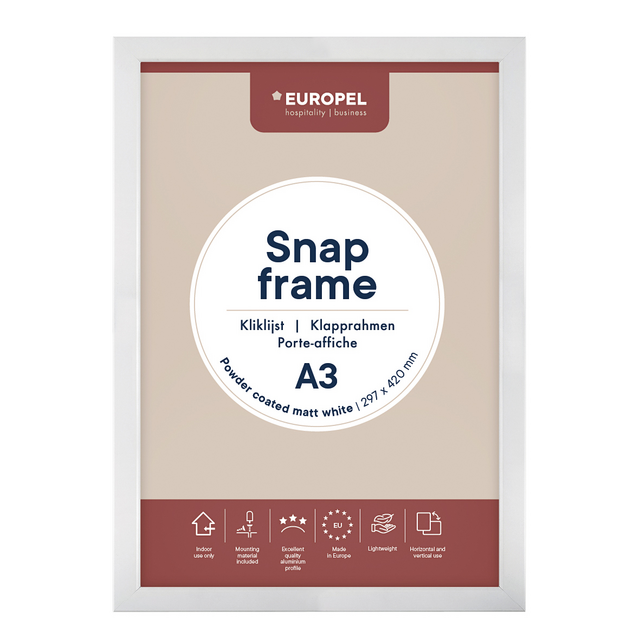 Geef uw posters de aandacht die ze verdienen met onze wit gepoedercoated kliklijst, de perfecte combinatie van luxe design en hoogwaardige kwaliteit. Of het nu gaat om zakelijke presentaties, reclamedisplays of informatieve borden, deze kliklijst biedt een stijlvolle en professionele uitstraling.Waarom kiezen voor onze luxe witte kliklijst?* Luxe uitstraling & duurzaam design – Het mat zwarte frame met een uniek profiel straalt klasse uit en biedt extra stevigheid.* Supersnel wisselen met het Easy-Click systeem – Vervang uw posters in een handomdraai, zonder gereedschap.* Topkwaliteit geanodiseerd aluminium – Krasbestendig, slijtvast en ontworpen om jarenlang mee te gaan.* Duidelijk en beschermd – De ontspiegelde voorzetfolie beschermt uw posters tegen vuil en vocht, zonder reflecties.* Elegant verstekhoek profiel – Een verfijnde afwerking die niet alleen mooi oogt, maar ook extra stabiliteit biedt.* Geschikt voor A3 posters (29,7x42,0cm) – Ideaal voor kantoren, winkels, restaurants en openbare ruimtes.* Profieldikte van 11mm – Slank en stijlvol design dat perfect aansluit op diverse omgevingen.* Keuze uit tijdloos zwart of stijlvol wit – Past perfect in elk interieur.* Eenvoudige montage – Inclusief 4 schroeven en pluggen voor een stevige bevestiging.