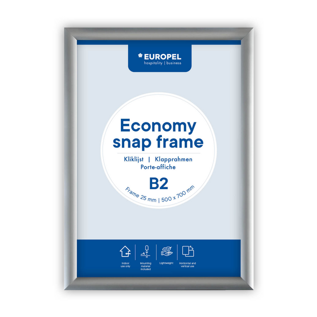* Verfijn uw presentaties met de Europel Economy Kliklijst voor B2-posters - een elegante oplossing met ons snelle Easy-Click systeem voor zowel efficiëntie als stijl! * Geef uw posters en boodschappen de aandacht die ze verdienen met deze strak vormgegeven kliklijst. * Vervaardigd van duurzaam aluminium en voorzien van een innovatief Easy-Click systeem, maakt deze lijst het mogelijk om uw content snel, moeiteloos en aantrekkelijk te presenteren. * Stijlvol aluminium frame: Uitgevoerd met een scherpe verstekhoek voor een moderne en professionele look. * Easy-Click systeem: Bevestig uw posters snel en gemakkelijk, voor een opvallende presentatie die direct de aandacht trekt. * Robuuste bouw: Gefabriceerd uit hoogwaardig aluminium, biedt de kliklijst een lange levensduur en een chique uitstraling. * Ontspiegelde voorzetfolie: Beschermt tegen vuil en vocht terwijl het zorgt voor een kristalheldere weergave van uw informatie. * Ideaal formaat: Geschikt voor B2-formaat (50x70,7cm), veelzijdig genoeg voor allerlei soorten presentaties. * Overige maten: De economy kliklijsten zijn te verkrijgen in de maten A0, A1, A2, A3, A4, A5, B1 en B2. * Slank ontwerp: Het 25mm dikke profiel zorgt voor een minimalistische flair en houdt de focus op uw inhoud. * Flexibele montage: Eenvoudig te plaatsen zowel horizontaal als verticaal, past in elke ruimte of setting. * Inclusief montagematerialen: Wordt geleverd met alle benodigde schroeven en pluggen voor een veilige bevestiging. * Verhoog de professionaliteit van uw presentaties met onze Europel Economy Kliklijst.