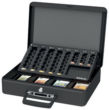 ProductinformatieAfmetingen: (L)370 x (D)290 x (H)120 mm,in gelakt staal, veiligheidscilinder met 2 sleutels, de muntsorteerder accepteert 8 soorten euromunten, afneembaar compartiment met 4 vakken voor bankbiljetten, 2 handvatten