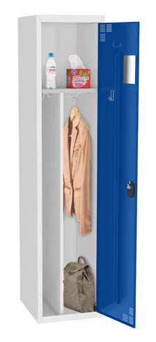 Locker voor gebruik in de vervuilende industrie. Hij beschikt over 2 verticale vakken, voorzien van een legplank bovenaan waarop een motorhelm kan geplaatst worden. De locker is voorzien van een ophangstaaf voor kleerhangers en een haak voor een handdoek, zodat stads- en werkkledij probleemloos kan opgehangen worden. Deze praktische opbergkast is bovendien voorzien van een extra haak en een spiegel op de deur. De locker heeft een behuizing in staalplaat, dikte 7/10e, wat een goede stevigheid garandeert. Door de epoxygelakte afwerking deinst de kast niet terug voor schokken of krassen. De deuren zijn voorzien van een verticaal omega-profiel voor een grotere weerstand. Om schimmel te vermijden is deze locker uitgerust met luchtroosters boven- en onderaan op de voorkant. De geïntegreerde etikethouder op de deur (etiket niet inbegrepen) maakt het mogelijk elke locker te benoemen. Om de inhoud van de locker te beveiligen, is hij voorzien van een slot voor een hangslot (hangslot niet inbegrepen), zodat de locker in alle discretie kan geopend worden.