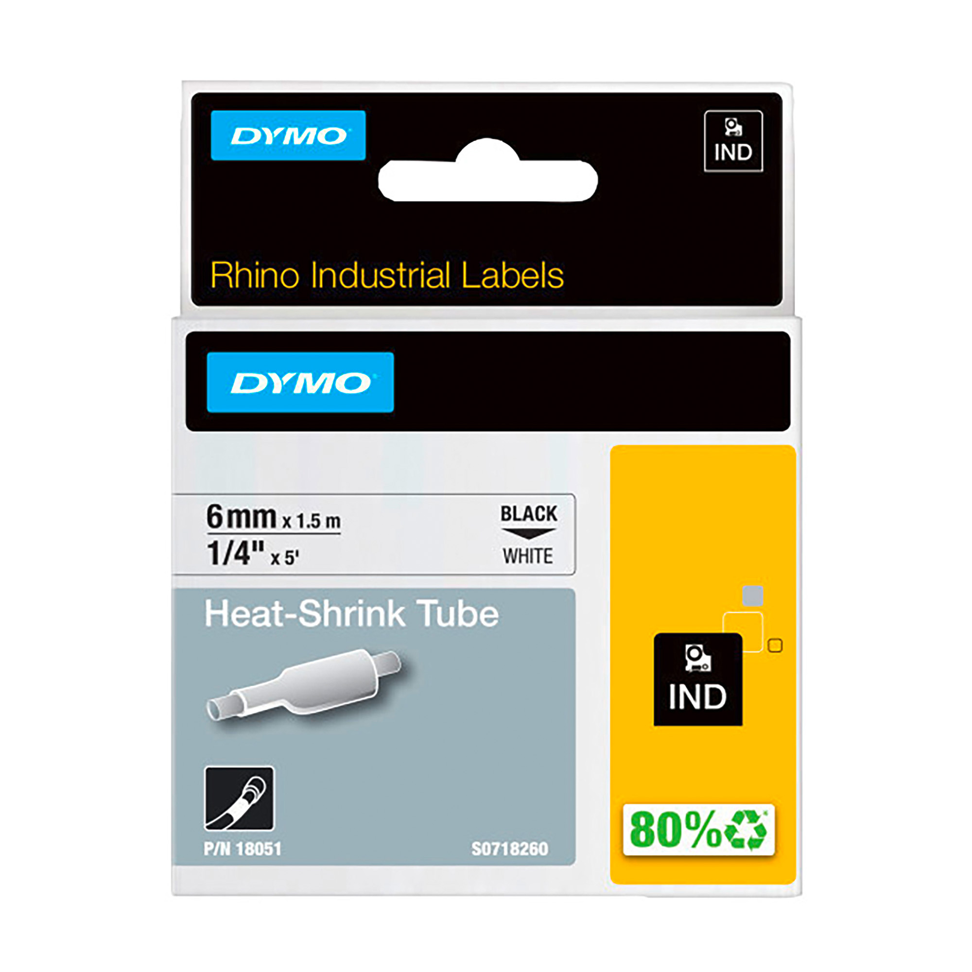 Industriële krimpkousen van DYMO Rhino (6 mm x 1,5 m), bedrukking in zwart op witte achtergrond voor Rhino-labelprinters.