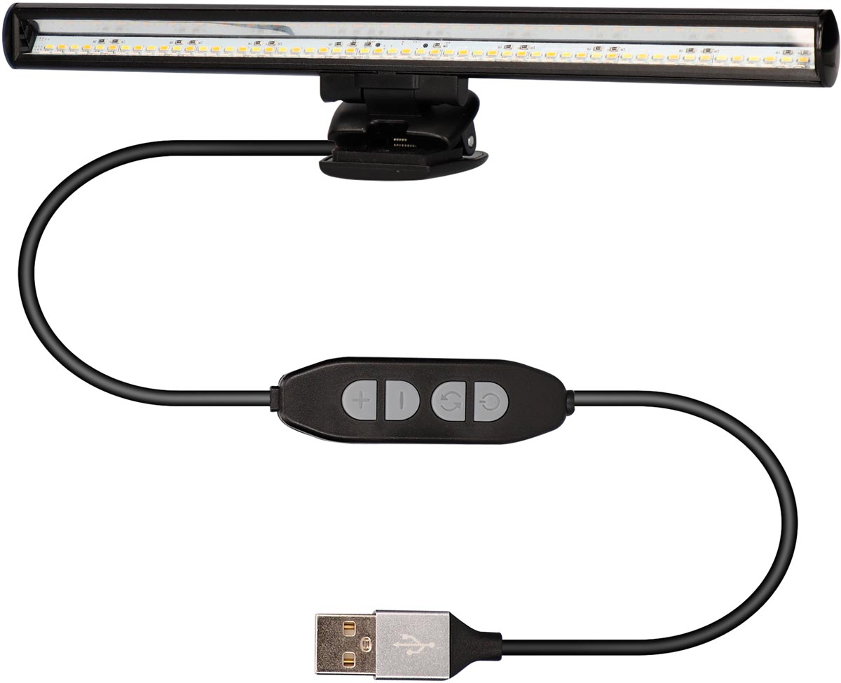 Type lamp: LED 5 W Temperatuur licht: 2800 - 6500 Kelvin 10 helderheidniveaus en 3 types licht (wit, warm en koel) Met klem om makkelijk te bevestigen, 90° kantelbaar Lengte kabel: 80 cm Werkt op USB-voeding Ft 26,1 x 2,2 cm Energieklasse B (Spectrum A tot G)