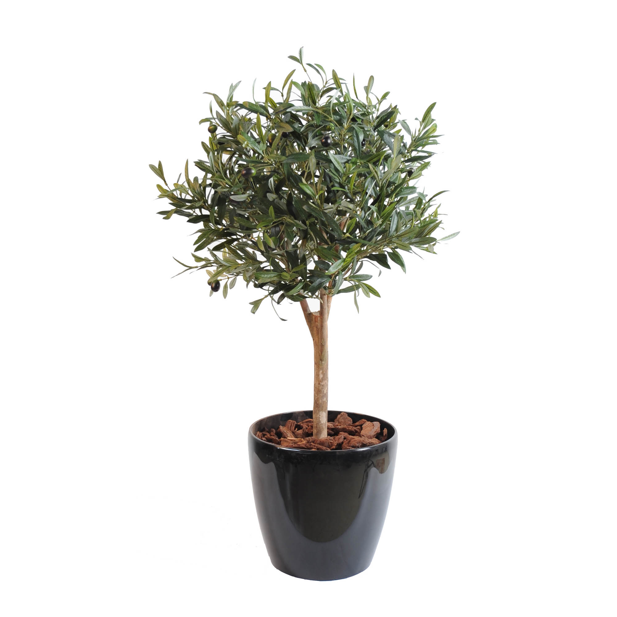 Bolvormige olijfboom, stam met een hoogte van 40 cm in hout en blaadjes in tergal. Totale hoogte 90 cm.