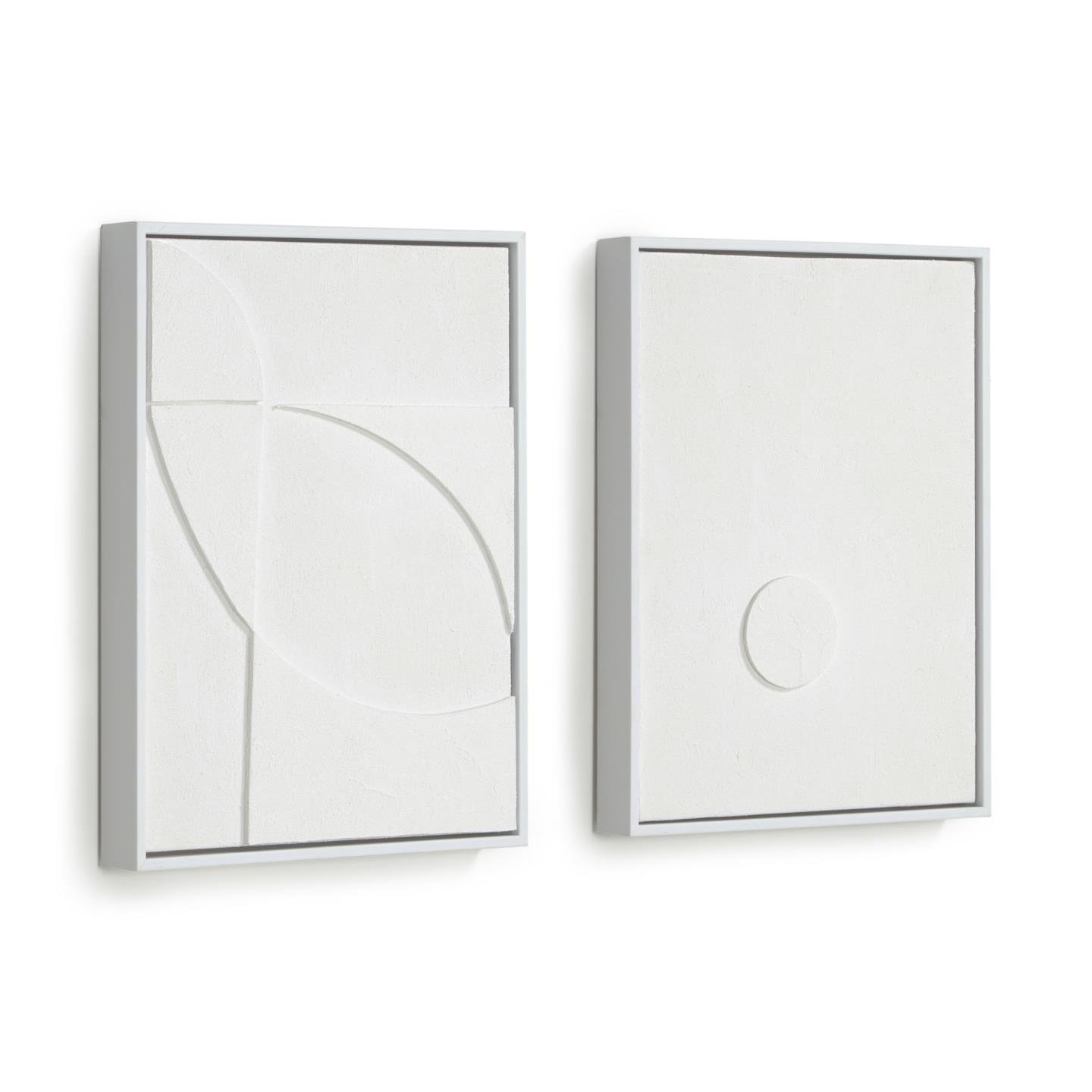 Minimalisme en natuur in de vorm van kunst. De set Brunella bevat twee kunstwerken met illustraties met reliëf. Op het ene zie je een cirkel tegen een effen achtergrond en op het andere een blad dat wordt gevormd door geometrische vormen. Puur design voor je wanden.- Wit kunstwerk op canvas van 32 x 42 cm met handgemaakte texturen en reliëfpatronen