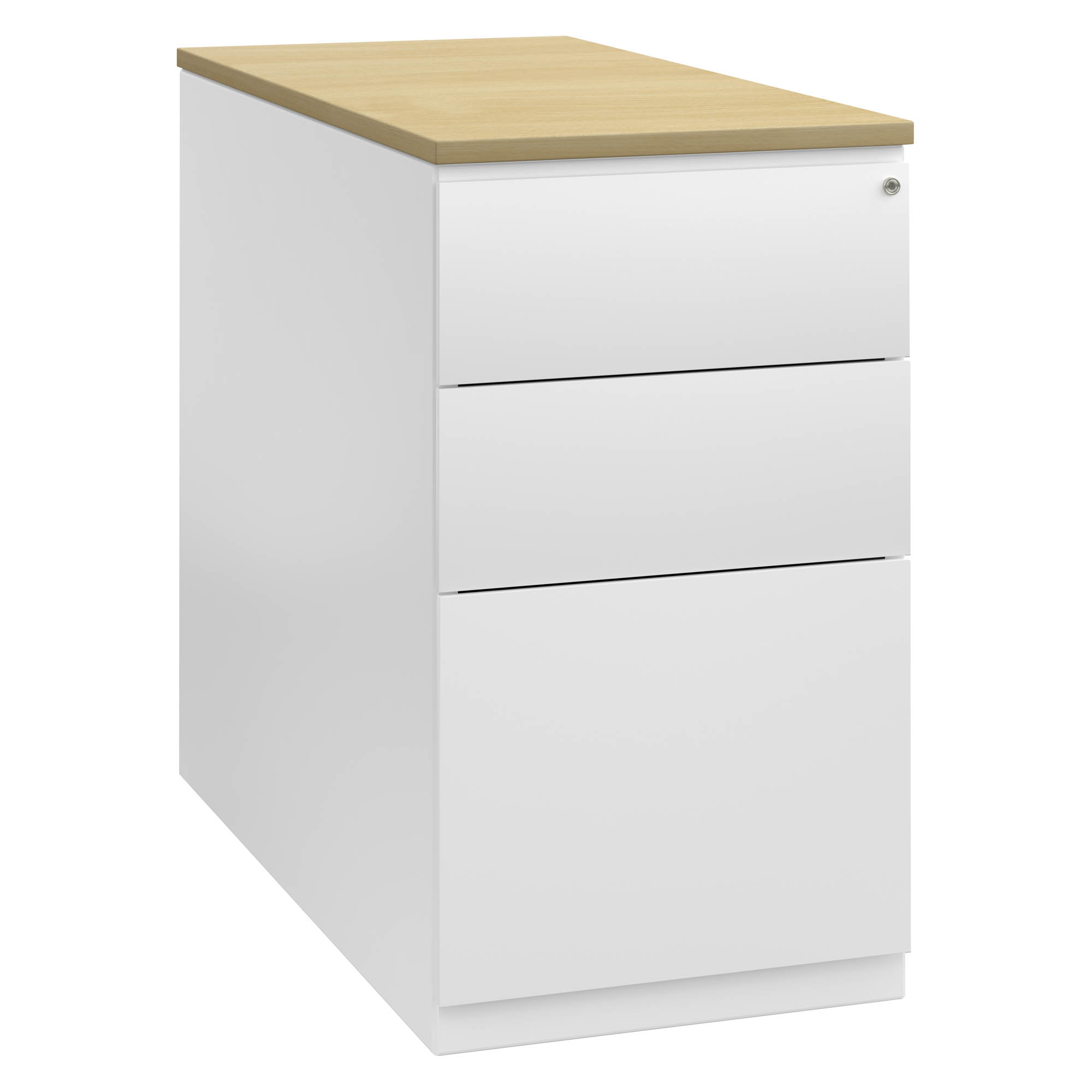 Kies tussen 5 kleuren voor de top (wit, grijs, beuk, lichte eik of kerselaar) en 3 kleuren voor de laden (aluminium, wit of antracietgrijs). De ladeblok bestaat ook met een diepte van 60 cm.
