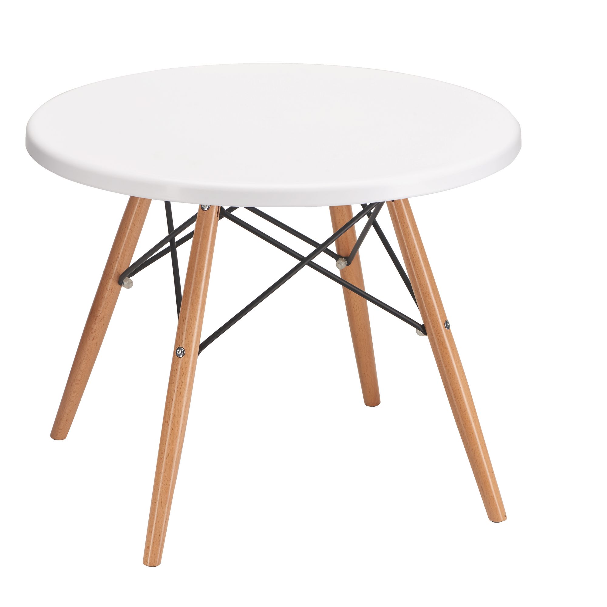 ProductinformatieTafelblad in polypropyleen dikte 26 mm.Cilindrische houten onderstel, eiken decor met zwarte stalen beugels.Afmetingen H 47 cm, Ø 59,5 cm.Kleur: wit of zwart.