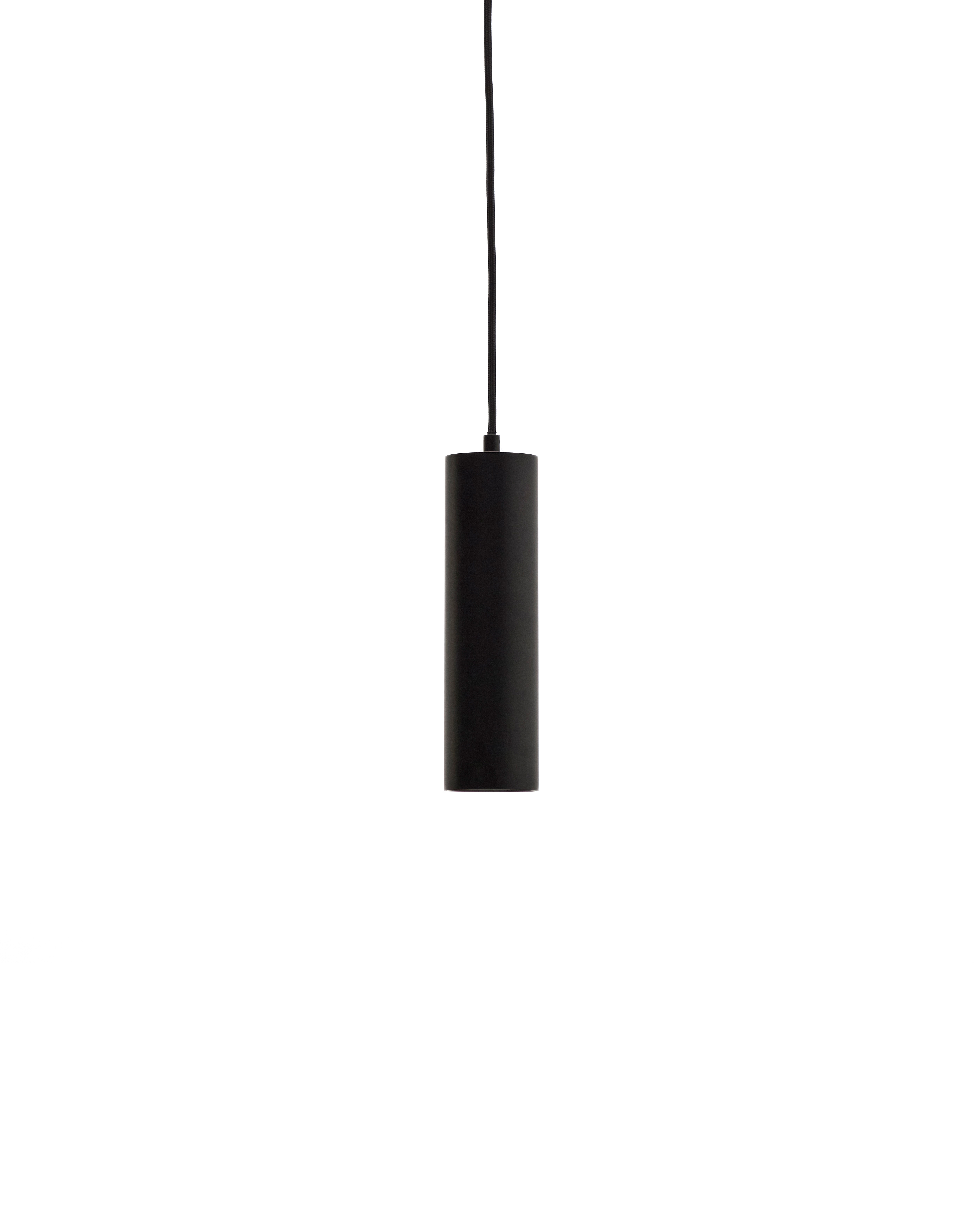 Plafondlamp met cilindrische aluminium kap in zwart gelakte afwerking.
