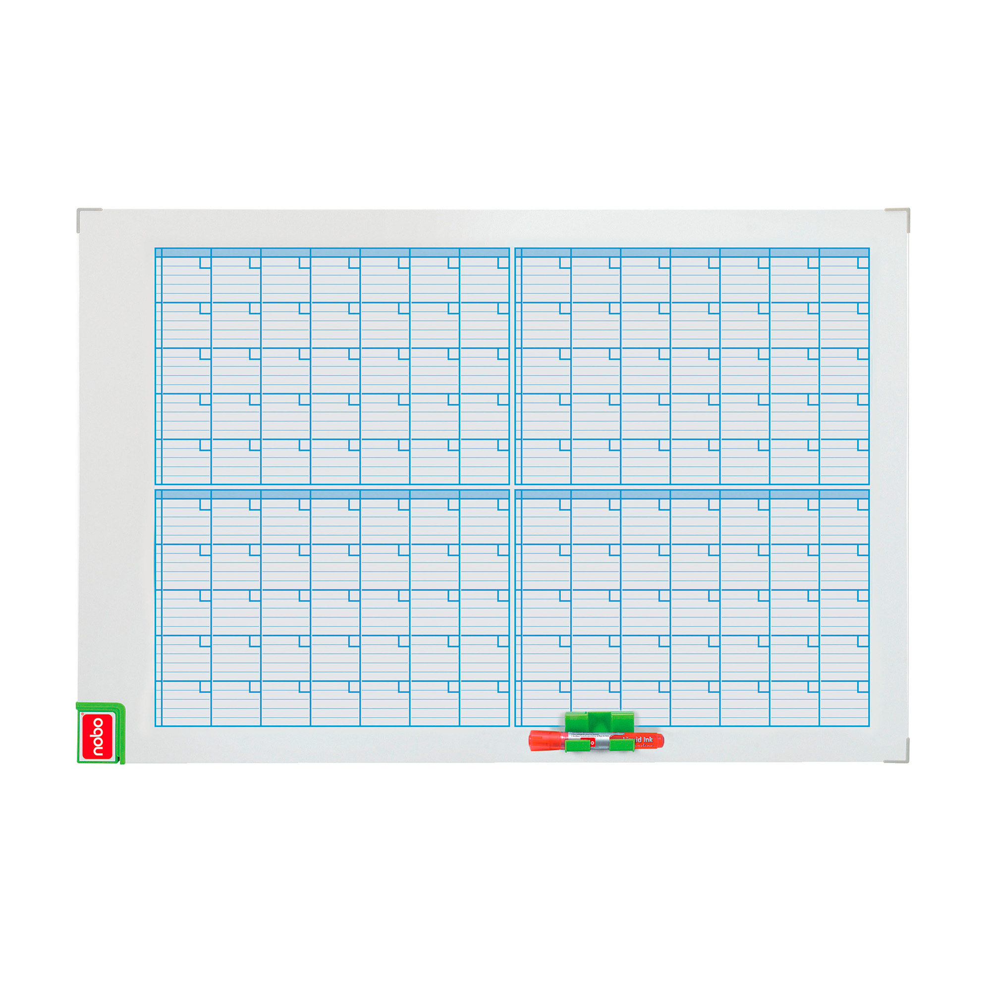 Maandplanner 7 kolommen voor elke dag, 5 lijnen voor de weken (35 vakken). Magnetisch oppervlak, droog uitwisbaar. Maanden, dagen en jaar zijn nog niet ingevuld: dit kan u zelf kiezen. Met wisser. Geleverd met markeerstift, magnetische clip voor markeerstift en set met rechthoekige magneten. Met kit voor muurbevestiging. Afmetingen: H 60 x B 90 cm.