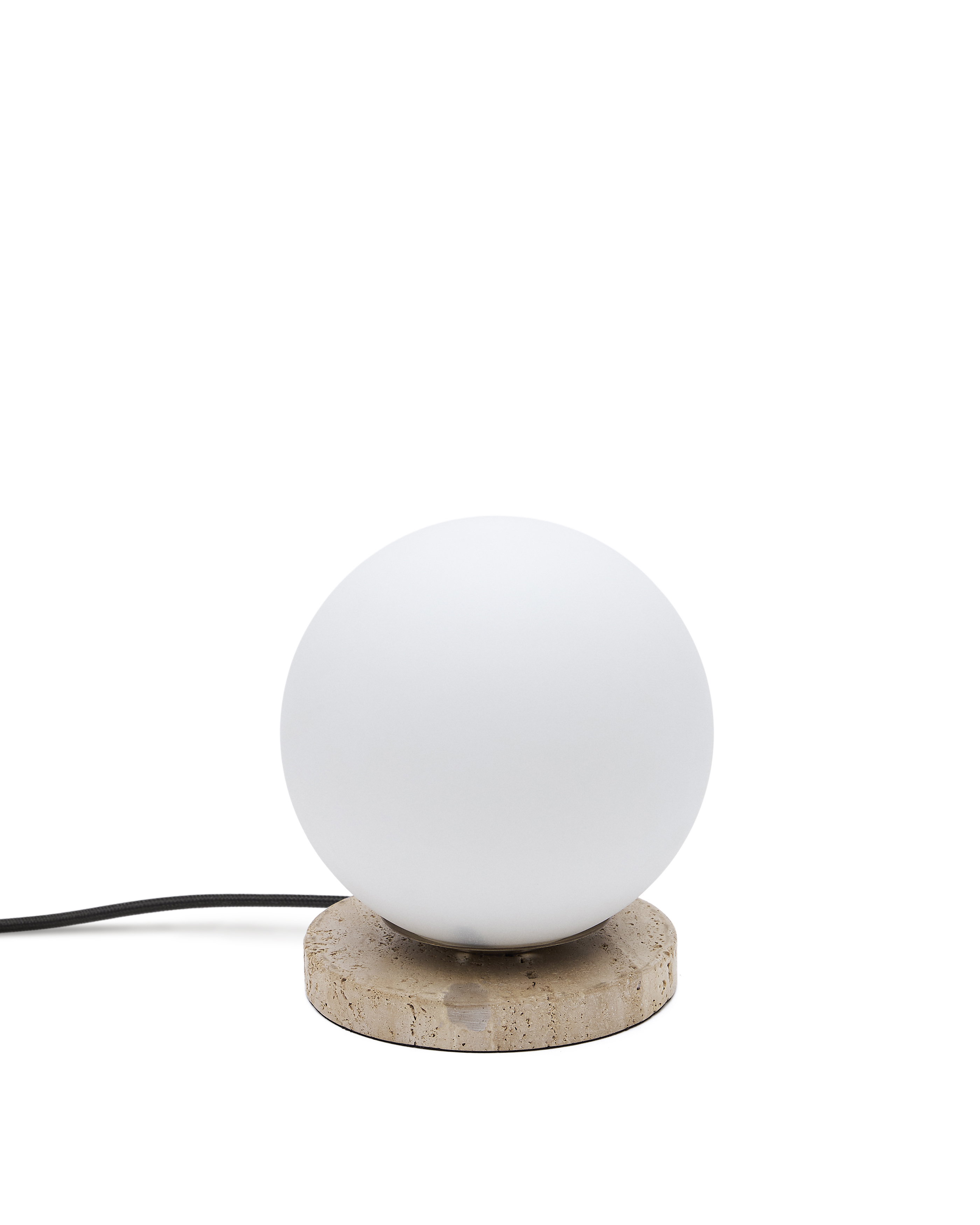 Tafellamp gemaakt van travertijn en matglazen kap.