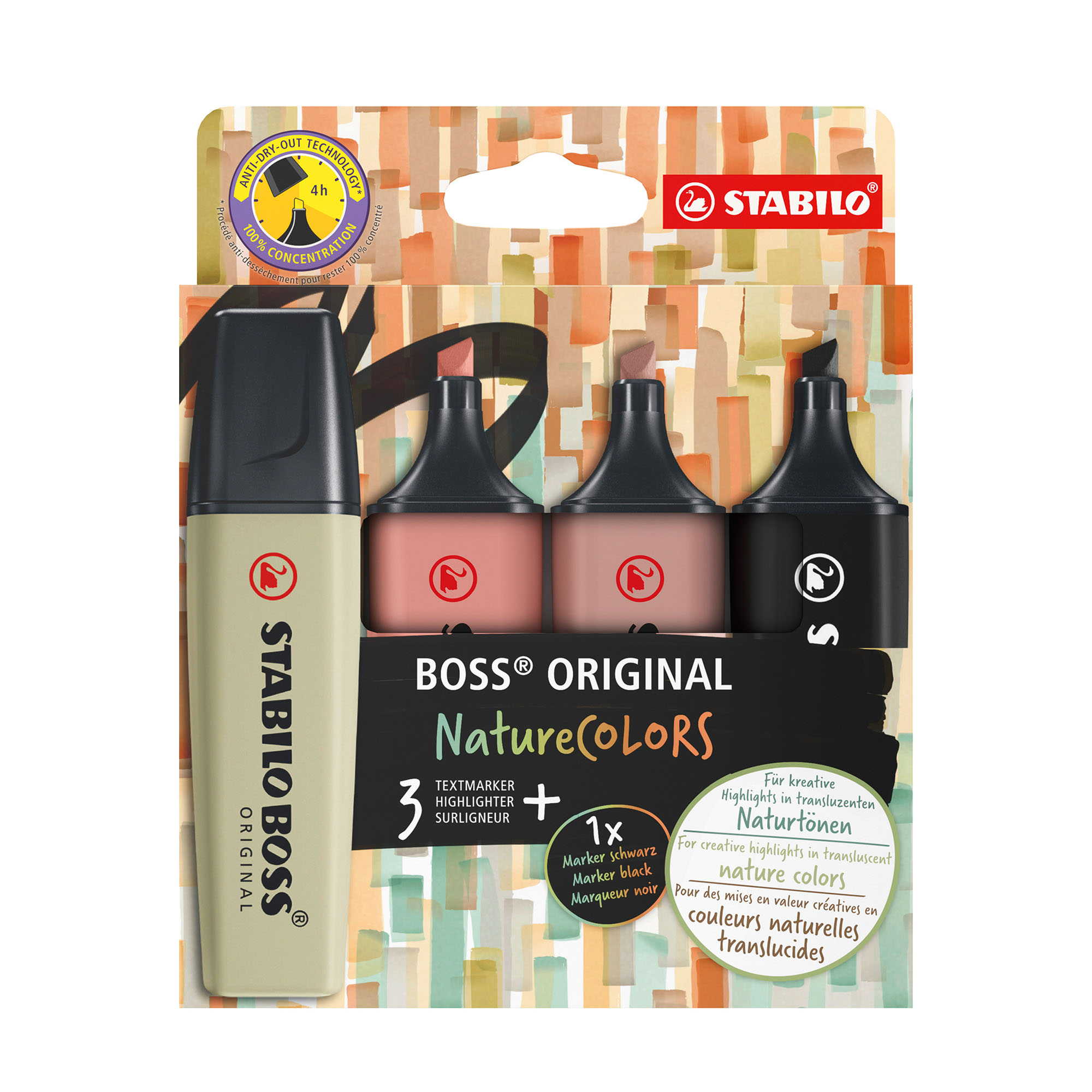 STABILO BOSS ORIGINAL, de essentiële highlighter sinds 1971, is verkrijgbaar in zes door de natuur geïnspireerde tinten, van limoengroen tot beige. Het is het ideale hulpmiddel om uw teksten subtiel te onderstrepen. Met dit kleurenassortiment kunt u ook een speciaal, elegant en esthetisch tintje aan uw creaties toevoegen. STABILO BOSS ORIGINAL NatureCOLORS, gemaakt in Duitsland, kan dankzij de antidroogtechnologie tot 4 uur open blijven zonder uit te drogen, zodat u gefocust kunt blijven. Het biedt een capaciteit van 375 m aan accentuering en de universele inkt op waterbasis verspreidt een uniforme kleur tijdens het hele gebruik. De afgeschuinde punt maakt 2 lijndiktes mogelijk: 2 mm voor de fijne lijn en 5 mm voor de dikkere lijn.