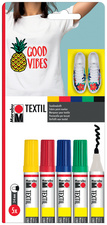 Breedte van de lijn: 2-4 mm, puntige punt, op water gebaseerde marker, bestand tegen licht en wassen tot 60 graden, voor lichte stoffen, assortiment van kleuren, inhoud: 5 stuks (011700080/0117000000080), namelijk 1 x geel, kersenrood, donkerblauw, lichtgroen, zwart, voor katoen, linnen, zijde, jute, viscose, stofmengsel, synthetisch, bevestiging door strijken.