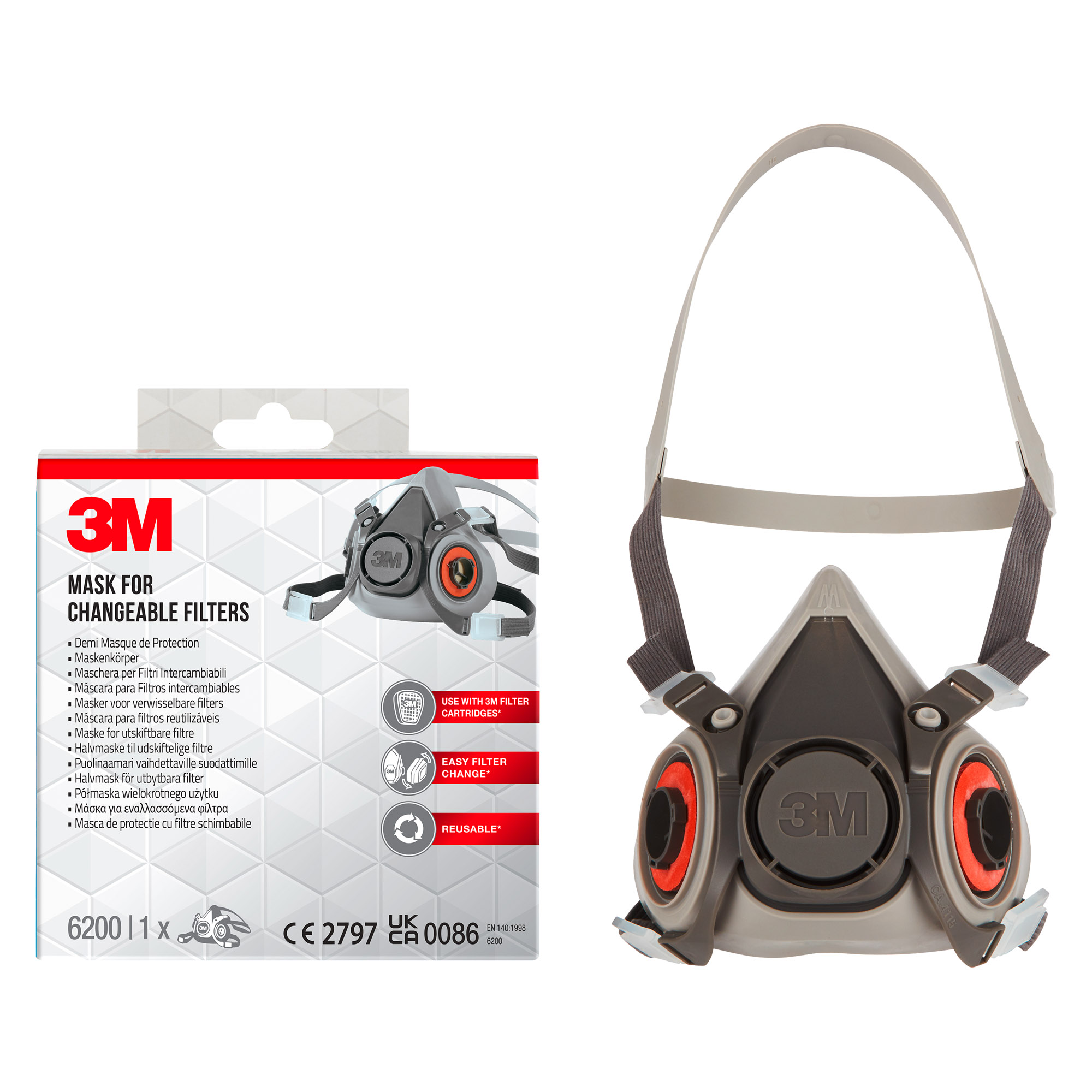 Herbruikbaar 3M™-halfgelaatsmasker voor verwisselbare filters is lichtgewicht, herbruikbaar, met dubbele inademventielen en grote filters om de ademweerstand te verminderen tijdens schilderen of schuren.