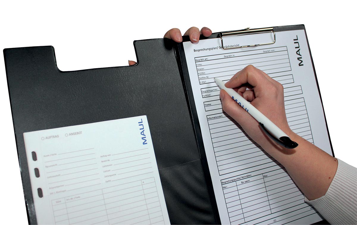 ProductinformatieKarton overtrokken met folie Insteekvak aan binnenkant van voorblad Metalen vlakke klem, zilverkleurig Met ophangoog Met pennenlus Klemwijdte: 0,8 cm
