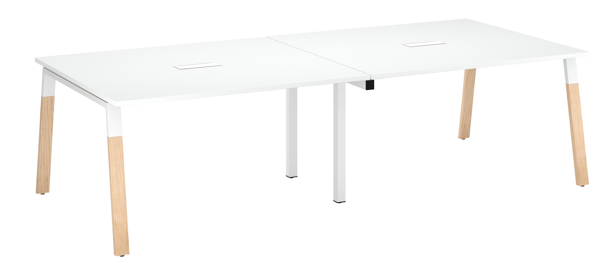Stevig blad gemaakt van 25 mm dik gelamineerd spaanplaat, behandeld tegen reflecties. Voorzien van bijpassende ABS-randen van 2 mm dik. Onderstel in boogvormig design van wit metaal en massief essenhout. Versterkende balken over de hele lengte van het blad. Een top access en een kabelgoot onder het blad vergemakkelijken het beheer van stekkers en bekabeling, voor nog meer efficiëntie.