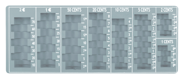 Productinformatie* Stevige Euro muntschikker met schaalverdeling voor waardebepaling. * De muntstukvakken verspringen om het tellen en identificeren te vergemakkelijken. * Bespaar tijd en moeite wanneer u de dagafsluiting maakt.