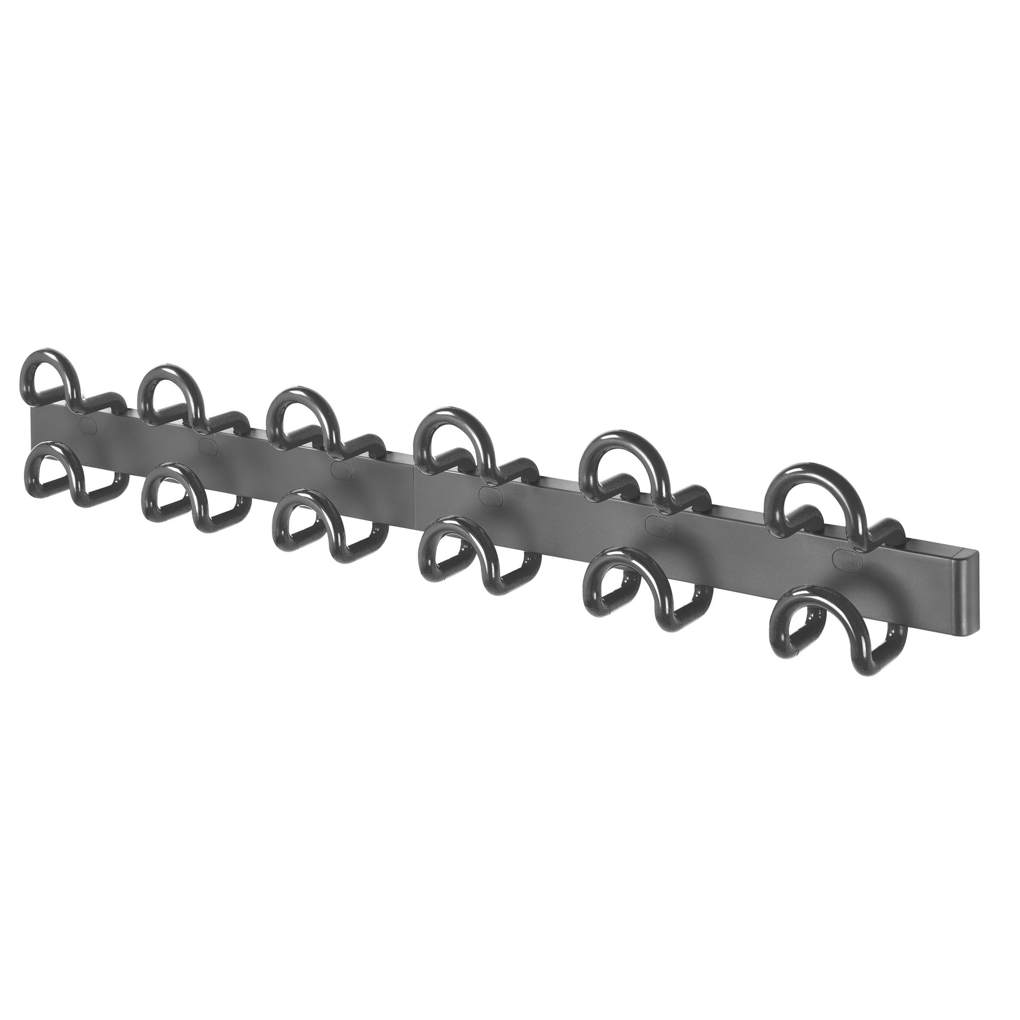 Geheel van 2 elementen van 3 kapstokken, naast elkaar te hangen door eenvoudig in elkaar te haken geleverd met afwerkingsdopjes en schroeven lengte 90 cm hoogte enkelvoudig model: 7,8 cm, dubbel: 14,6 cm model 6 enkelvoudige haken model 6 dubbele haken haken, wandkapstok