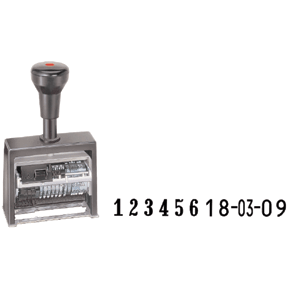 Datum-nummerstempel (datum rechts). Moderne onbreekbare montuur in kunststof. Lichte uitvoering. Nummer: 6 rijen cijfers, 0, 1, 2, 3, 4, 5, 6, 12 + 20x herhalend, met of zonder nullen (lettertype: Antiqua). Datum: rechts in cijfers (lettertype: blok). Nummer verspringt automatisch, datum is verstelbaar met stift. Schrifthoogte: 4,5 mm. Inktkleur: zwart of rood.