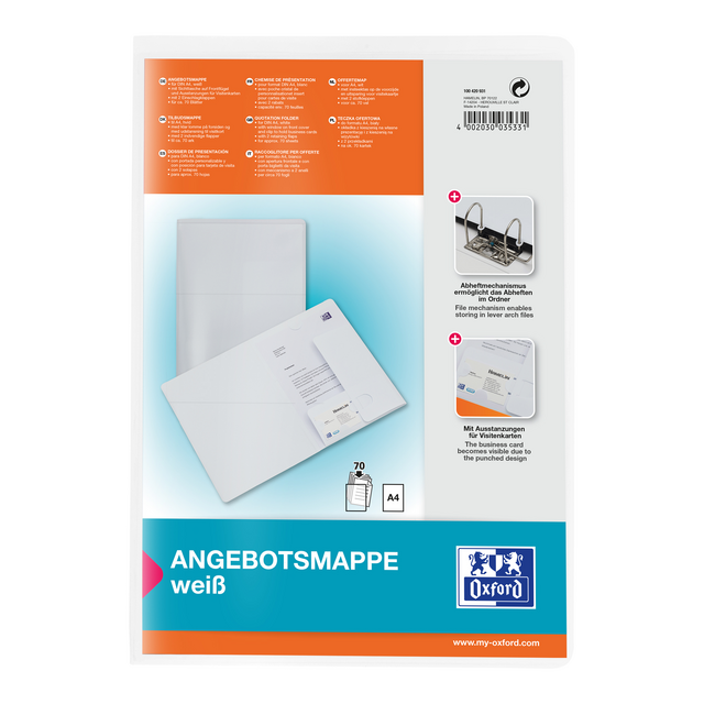 * Kunststof offertemap op A4-formaat. * Met insteektas op de voorzijde voor individuele opmaak. * Insteek voor visitekaartje. * Uitsparingen voor het opbergen in ordners. * Voor het professioneel opbergen van offertes en andere documenten. * Capaciteit 50vel papier. * Met 2 stofkleppen. * Afmetingen 222x315mm.