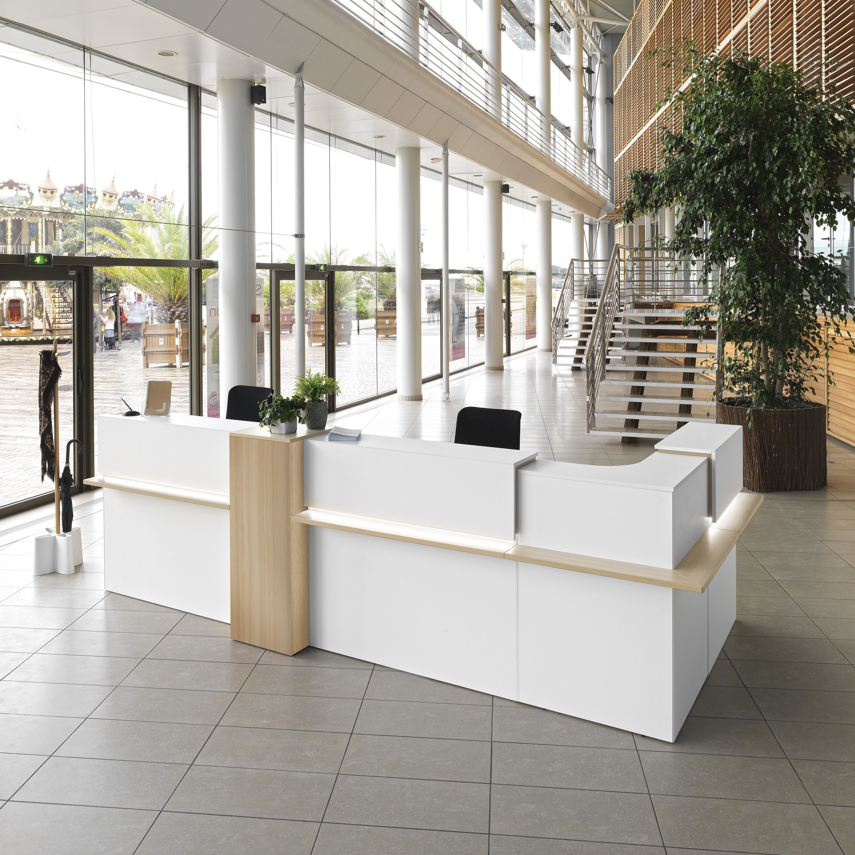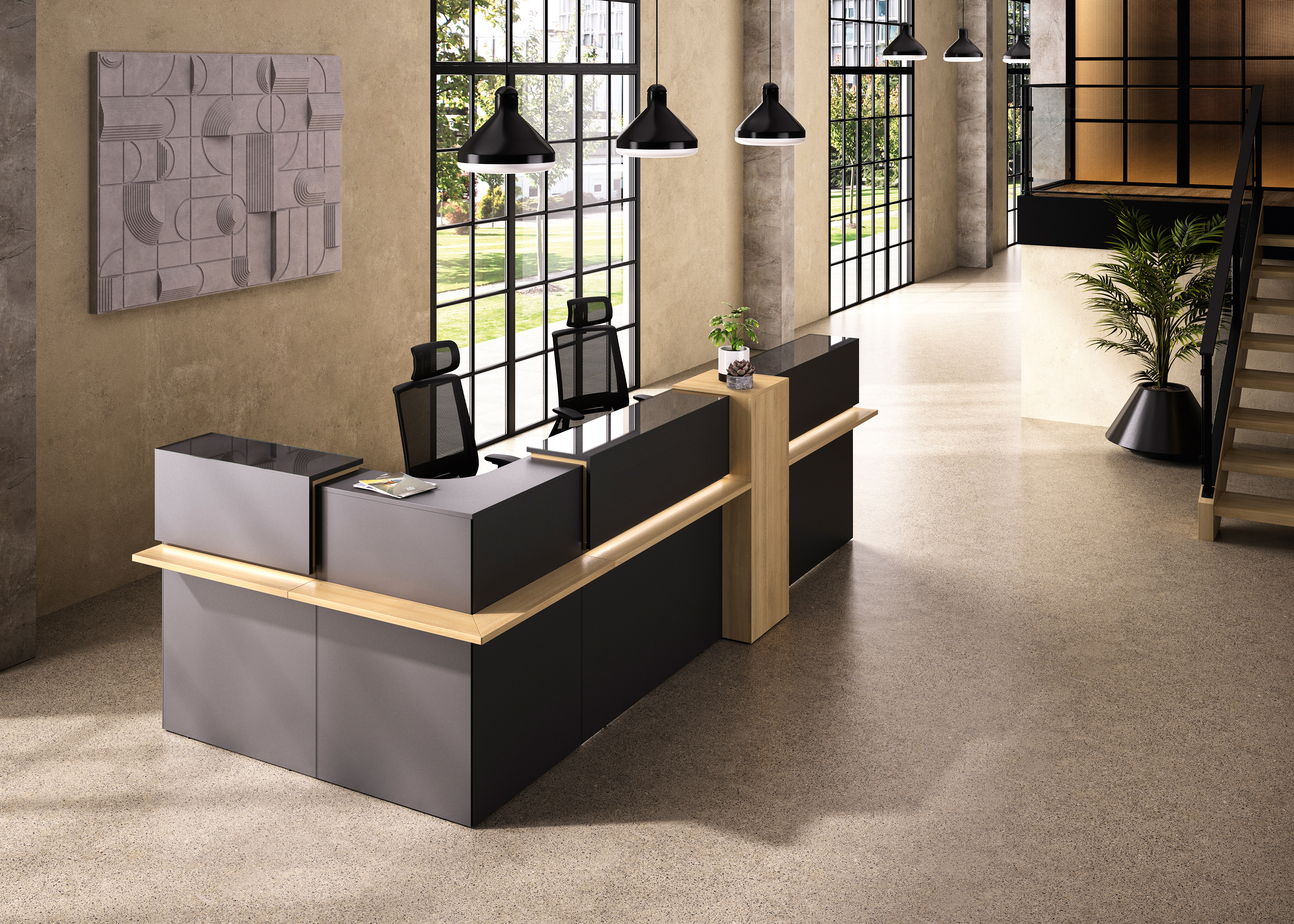 Voor dit assortiment receptiebalies zijn vele configuraties mogelijk. Deze configuratie omvat een ledverlichting aan de bovenkant, een opbergplank voor tassen aan de binnenkant, en een verwijderbare en verstelbare nis met 4 standen waarmee u in alle vertrouwelijkheid een scherm kunt plaatsen.