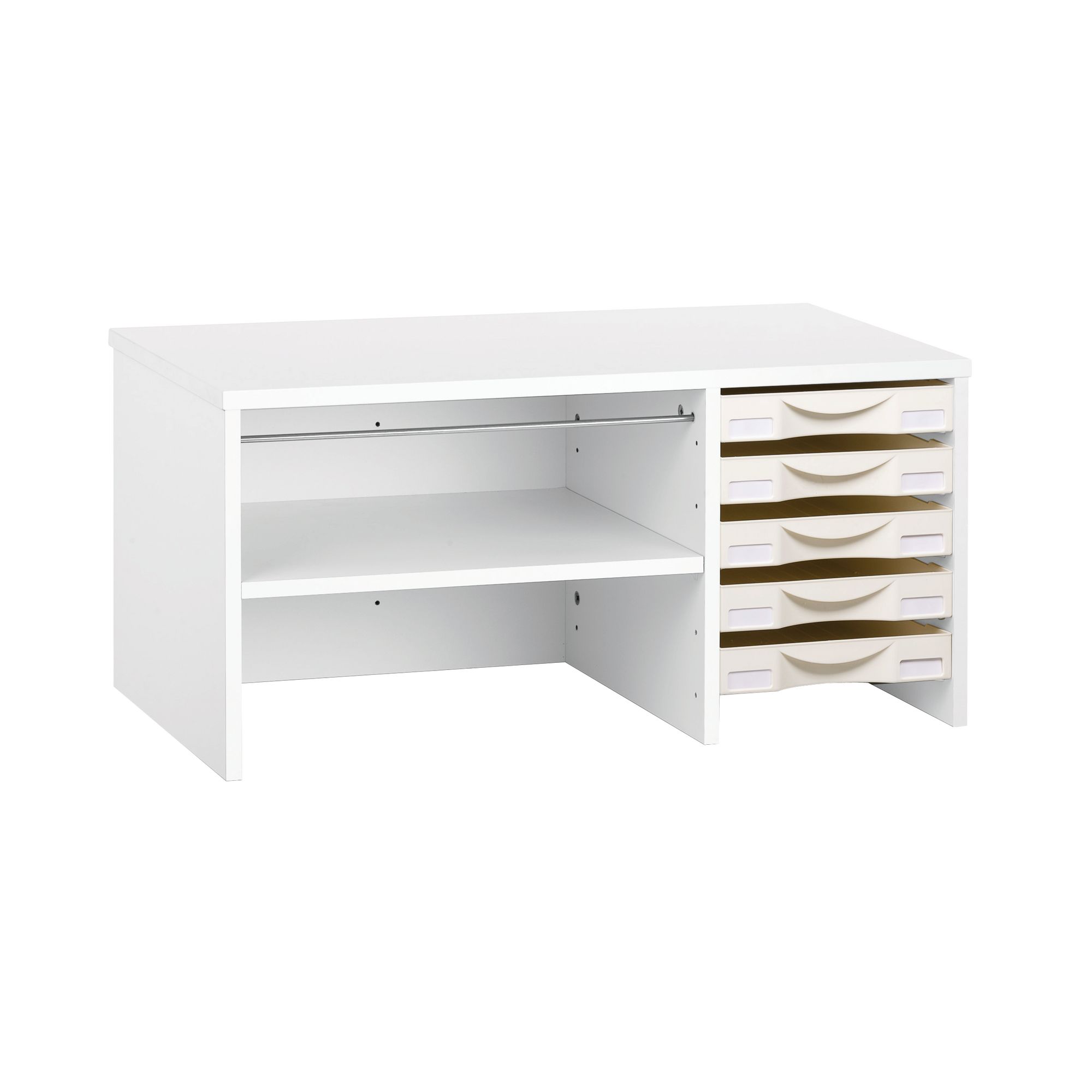 Optimaliseer het klassement van uw documenten met dit opbergmeubel van Intuittiv'. Met een grote weerstand, gemaakt van spaanplaat met een dikte van 25 mm. Vereniging van soberheid en design, met een mooie afwerking dankzij de gemelamineerde bekleding. Uitgerust met 5 laden in PVC voor een gemakkelijker klassement van uw document. Tijdens de montage kunt u dit opbergmeubel zowel links als rechts installeren. Uiterst praktisch, beschikt over een opbergvak met 2 metalen ophangstangen. Hierdoor kunt u tot 40 hangmappen ophangen. Beschikbaar in verschillende kleuren voor de afwerking van de bovenkant, zodat het bij alle stijlen past: wit, lichte eik, groen, blauw en violet.