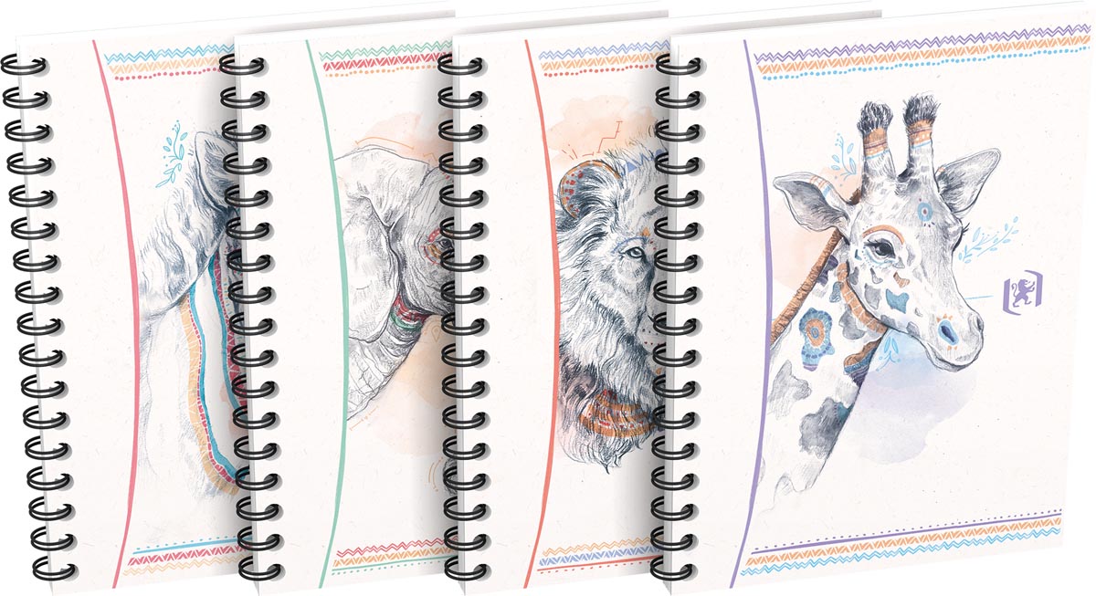 ProductinformatieOptik papier van 90g/m² 100 bladzijden (50 vel) Geruit 5 mm Dubbelspiraal om 360 graden open te leggen Harde kartonnen kaft die zacht aanvoelt Geassorteerde designs Certificaat: EU Ecolabel