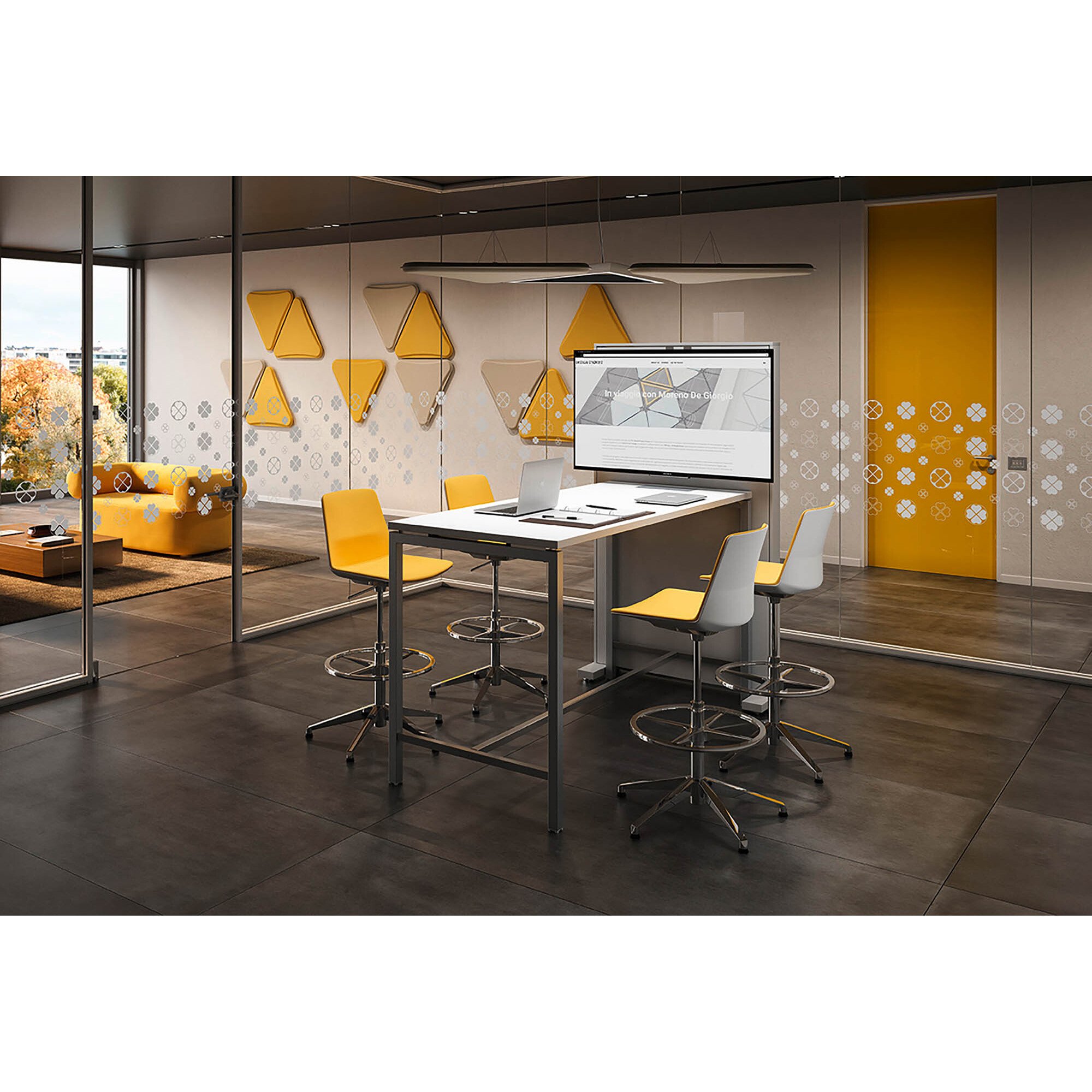 Het mobiele tv-meubel is ontstaan uit de behoefte aan flexibiliteit, typerend voor hedendaagse kantoren, waar vergaderingen en uitwisselingen altijd efficiënt moeten zijn. De Boxy-tafel, past perfect bij de Boxy TV-steun, ideaal voor vergaderingen en groepsactiviteiten.