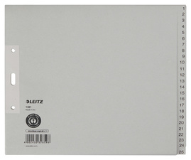 ProductinformatieGrijs, 25 toetsen, middelgroot, 100 g/m², perforatie: 80 mm,versterkte perforatie op het eerste vel, met markeerlabel voor inhoudsidentificatie, met registerreeksenvoor een genummerde ordening, afmetingen: (L)240 x (H)210 mm.