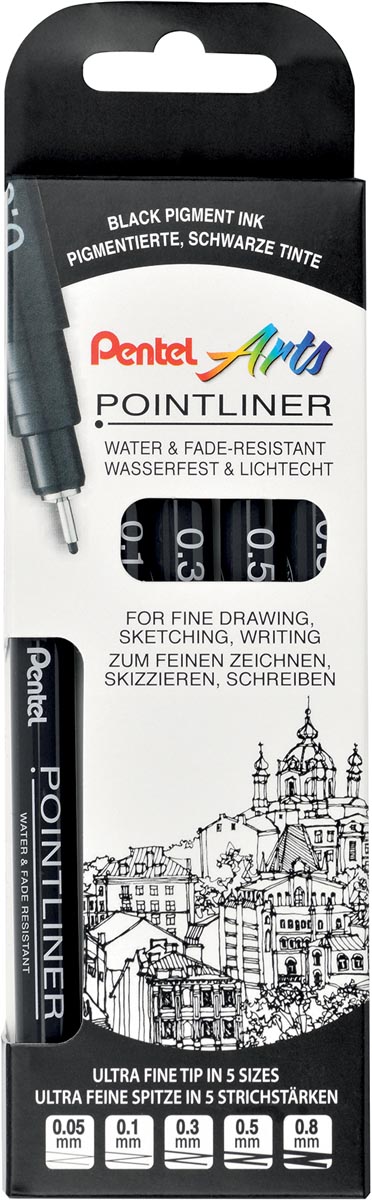 ProductinformatieFijnlijner met gepimenteerde inkt, water- en lichtbestendig. Ideaal om te schetsen en te tekenen maar ook om gewoon mee te schrijven. Zwarte inkt. Met dop. Metalen clip.