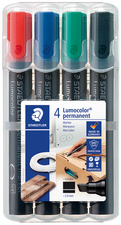 ProductinformatieLijnbreedte: 2,0 - 5,0 mm, schuine punt, waterbestendig, navulbaar, DRY SAFE, in een gepatenteerd etui van STAEDTLER, in de kleuren: blauw, zwart, rood, groen, oranje, paars, inhoud: 6 stuks,zwarte behuizing, tip en dop in lijnkleur.