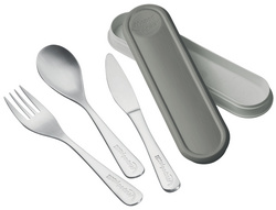 ProductinformatieSet bestaande uit: mes, vork & lepel van roestvrij staal, gravure 'Maped PICNIK', in een plastic doos voor het vervoer & het meenemen van het gebruikte bestek, vaatwasmachinebestendig, lengte van het bestek: 155 mm.