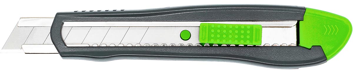 ProductinformatieHouder uit plastic, makkelijk te vervangen mesjes. Automatische blokkering van het mes. Kleur: zwart/groen.