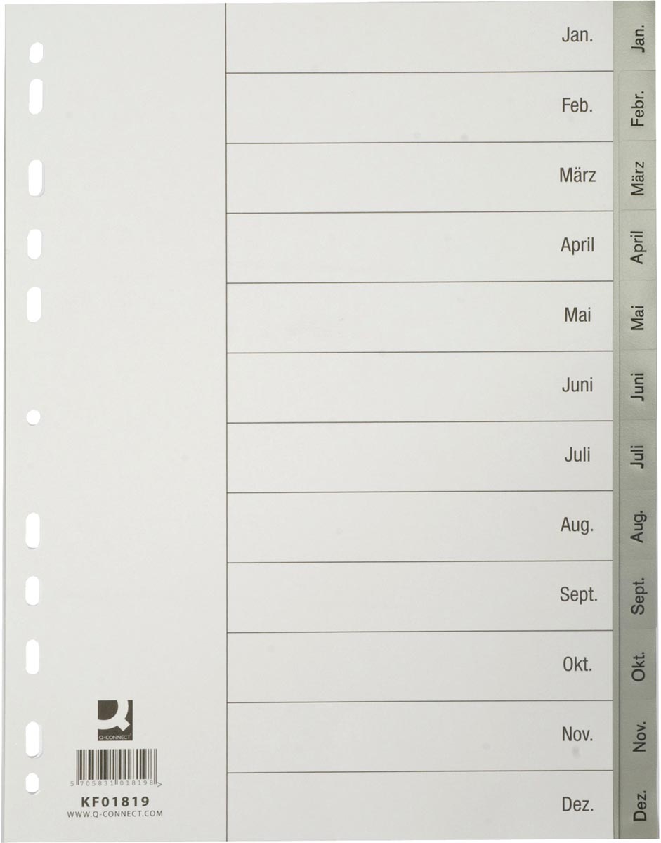 Q-CONNECT tabbladen, A4, PP, 11-gaatsperforatie, met indexblad, set van Jan-Dec, grijs