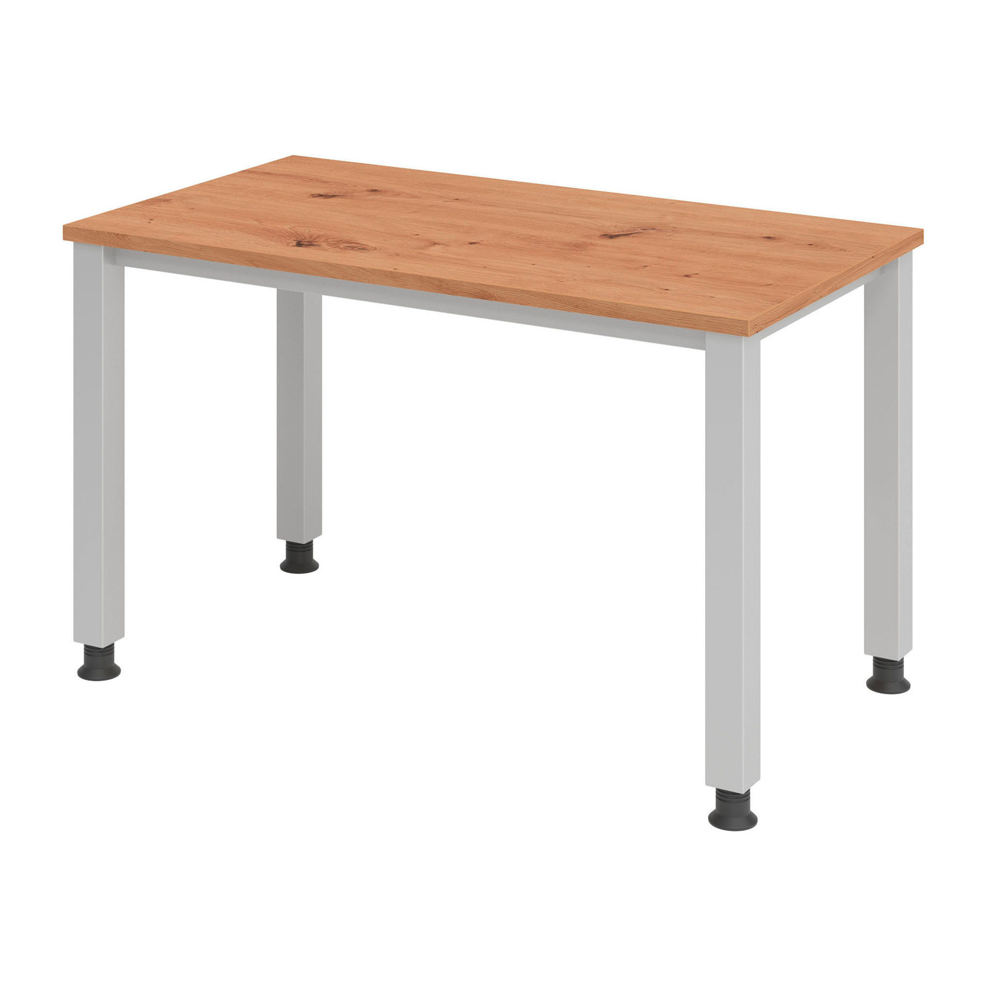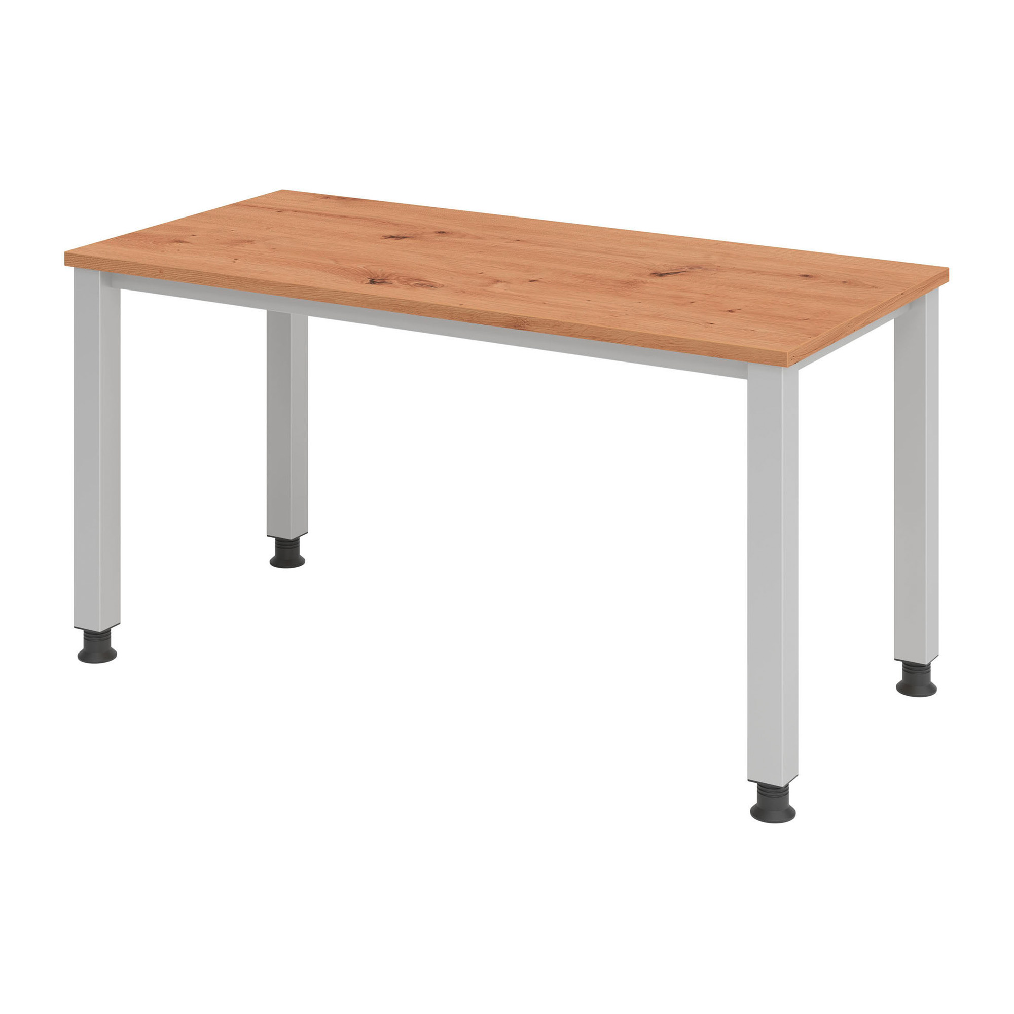 Werkhoogte tussen 68,5 en 81 cm. Progressief verstelbaar in de hoogte. Werkbladdikte: 2,5cm. Zilverkeurig vierkant onderstel (gelijkwaardig aan RAL 9006) met 6 x 6 cm diameter. Verstelbare voet, diameter 3 cm. Kader onder werkblad H 2 x D 4 cm . Werkblad beschikbaar in 2 kleuren: donkere eik, wit.