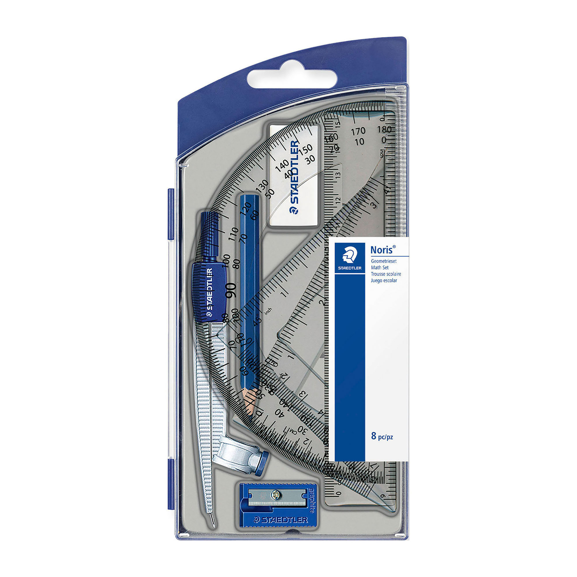 Passer voor het tekenen van cirkels met geïntegreerde universele passerbevestigingsarm voor potloden tot 11 mm diameter en een drogepuntarm, 1 kort HB-potlood, 1 witte gum, 1 wegwerpbare puntenslijper, 1 maatliniaal 15 cm, 2 geodriehoeken 45° en 60° en 1 gradenboog.