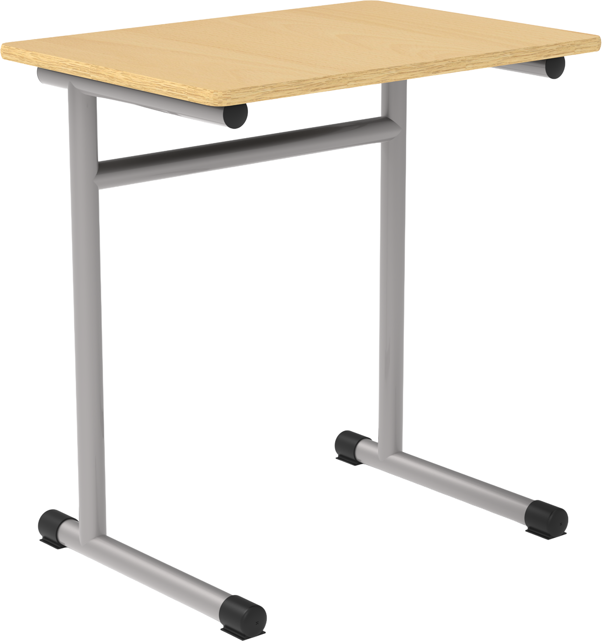 Tafel T5 met 1 plaats en gelaste boekentashaak. Verzachte randen in natuurlijk gelakt massief beukenhout, aangebracht onder laminaat. Blad van spaanplaat bedekt met laminaat voor een totale dikte van 20 mm. Draagconstructie in buisvormig metaal, diam. 40 mm. H 71 cm.
