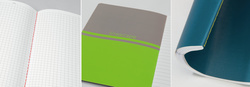 148 x 210 mm, zachte kartonnen omslag met textuureffect, wit papier, 80 g/m2, 68 pagina's (34 vellen), genaaid met neonoranje draad, verpakt per 2 stuks, kleur: lichtgrijs / oranje.