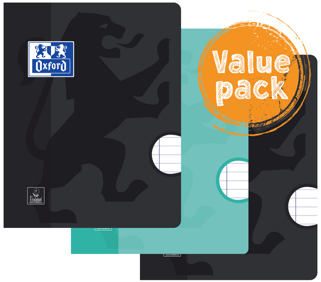 * Een voordeelpak met daarin drie Oxford A4 schriften, twee zwarte en een turquoise. * Hoge kwaliteit papier, extra glad en extra wit. * Met Optik Paper; laat geen inkt door, zelfs als je schrijft met vulpen. * Ronde hoeken om ezelsoren te voorkomen. * De schriften bevatten 36 vellen, 72 pagina’s, met kantlijn. * Soepele kartonnen kaft. * Het papier is gecertifieerd met het EU Ecolabel (garandeert dat in de hele levenscyclus van het papier de milieubelasting laag is)