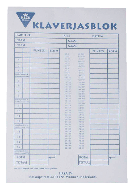 * Klaverjassen scoreblok met 50 vellen. * Formaat: 14,8 x 21cm.