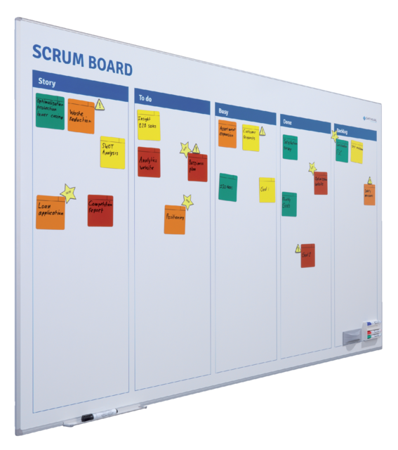 Het Scrum Bord laat u in één oogopslag de status van uw lopende projecten zien.U creëert zo direct overzicht voor alle betrokkenen. Magneethoudend en drooguitwisbaar De Scrum Board starterkit bestaat uit: 1x Symbool Post-it groen, set van 5 stuks 1x Symbool Post-it geel, set van 5 stuks 1x Symbool Post-it oranje, set van 5 stuks 1x Symbool Post-it rood, set van 5 stuks 1x Symbool Attention geel/zwart, set van 5 stuks 1x Symbool Ster geel/zwart, set van 5 stuks 1x Boardmarkers assorti, set van 4 stuks 1x Penhouder wit horizontaal, magnetisch 1x Viltwisser Pro, magnetisch voor whiteborden.