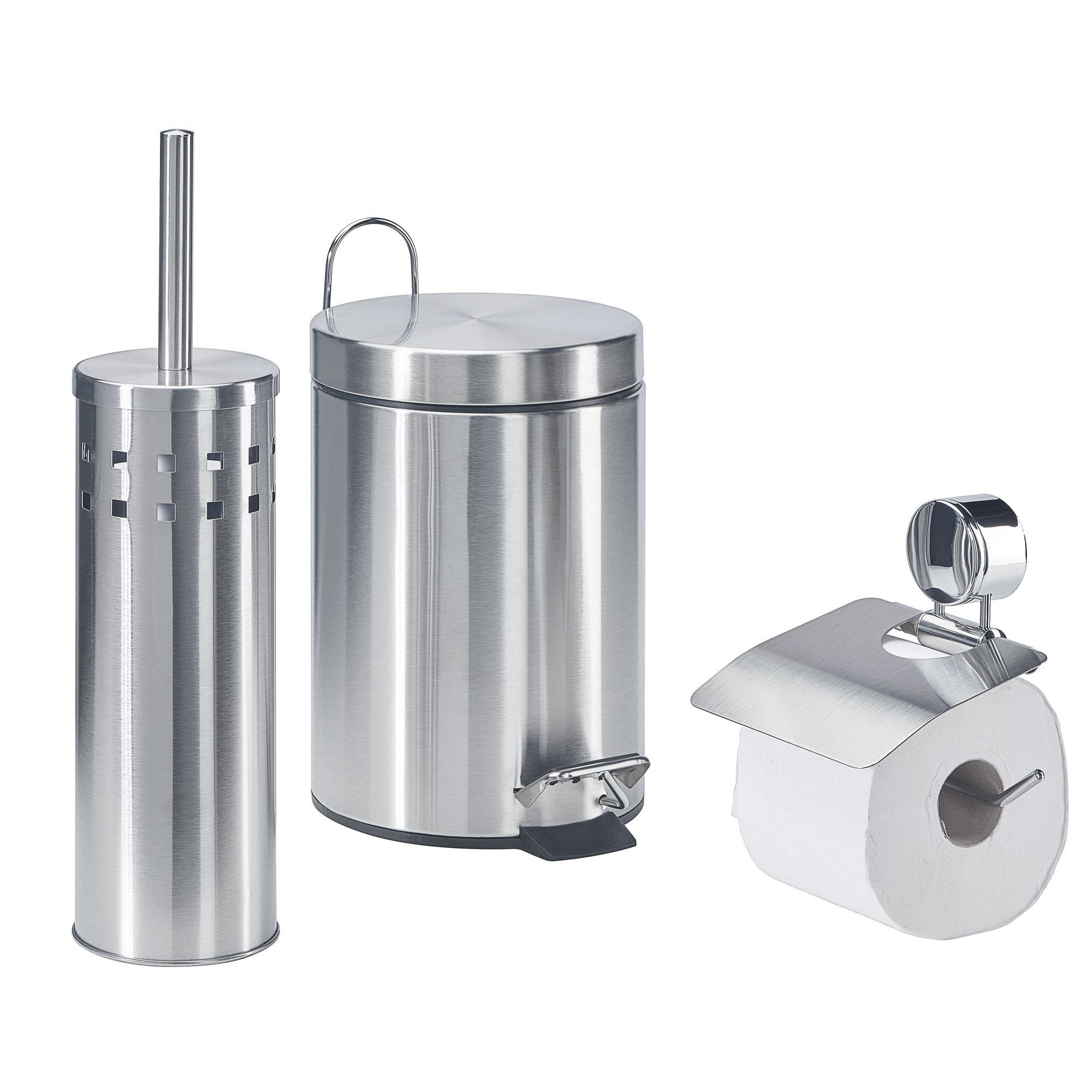 ProductinformatiePak bestaat uit een toiletborstel (afmetingen: B 12 x D 13,5 cm), een pedaalemmer van 3 L (afmetingen: H 25 x Ø 17 cm) en een houder voor toiletpapier (afmetingen: H 37 x B 9,5 cm).