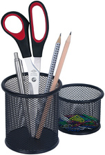 ProductinformatieGepoedercoate ijzerdraad, 2 stuks, rond. Groot potlodenbakje: diameter: 100 mm, hoogte: 85 mm, klein potlodenbakje: diameter: 75 mm, hoogte: 70 mm.